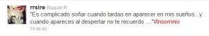Otra usuaria amante de la buena literatura es Raquel R. (@rrsire), compañera de profesión, que habitualmente me permite disfrutar de frases cargadas de sentimiento y emoción