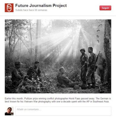 - Fotoperiodismo: Pinterest resulta una estupenda plataforma para que los periodistas gráficos puedan exponer sus reportajes. Como ejemplo, el trabajo que realizan los componentes de Future Journalism Project.