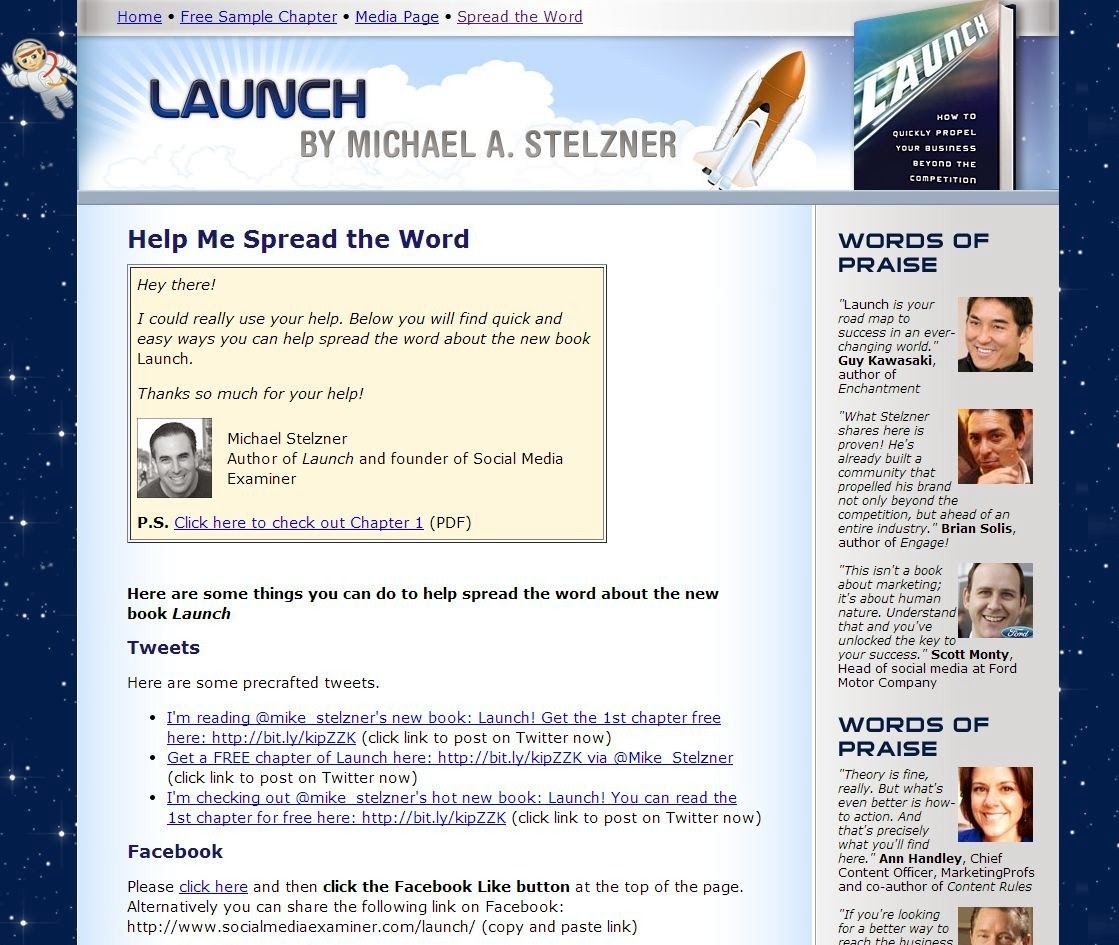 En la web que el fundador de Social Media Examiner, Michael A. Stelzner, creó para su libro «Launch», dedica un apartado específico que recoge ejemplos de acciones promocionales que, las personas que quieran ayudarle a difundir la publicación, pueden llevar a cabo a través de los medios sociales. El propio autor explica como realizar cada acción, e incluso deja tuits listos para promocionar el libro, por ejemplo.