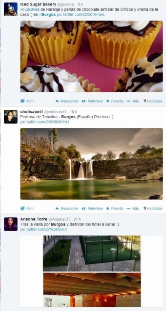 Se trata de introducir filtros en las búsquedas de Twitter, y añadir también smiles para incorporar los sentimientos a lo que queremos encontrar. Un ejemplo: quiero buscar fotos positivas sobre Burgos. Mi búsqueda debería ser: Burgos 🙂 filter:images. El resultado lo podéis comprobar a la derecha.