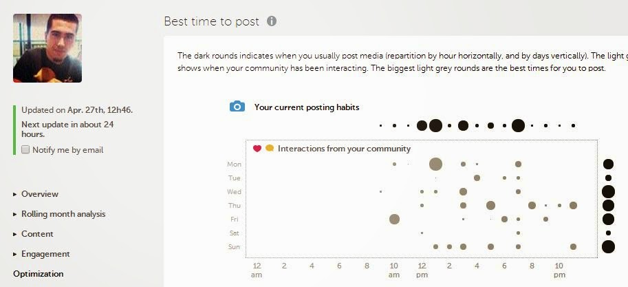 Ejemplo: Mi gráfico indica que las mayores interacciones las recibo los lunes a la 1 de la tarde, y el viernes a las 10 de la mañana (círculos grises más grandes). Sin embargo, en líneas generales, la franja de entre las 3 y las 7 de la tarde parece ser la mejor para publicar a diario, siendo el sábado el peor día con diferencia.