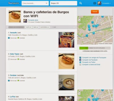 Simplemente busca la palabra «wifi» con tu ubicación, y guarda los resultados en listas. Por ejemplo, yo me he creado una muy útil con sitios para tomar algo en Burgos que disponen de conexión para sus clientes.
