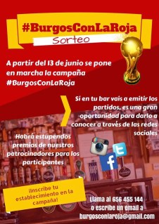 Por eso he creado #BurgosConLaRoja :). Básicamente la campaña consiste en que los establecimientos que se apunten, serán los lugares desde los cuales cualquier persona que vaya a ver allí un partido pueda transmitir la emoción y el ambiente del local a través de las redes sociales, y además ganar estupendos regalos.