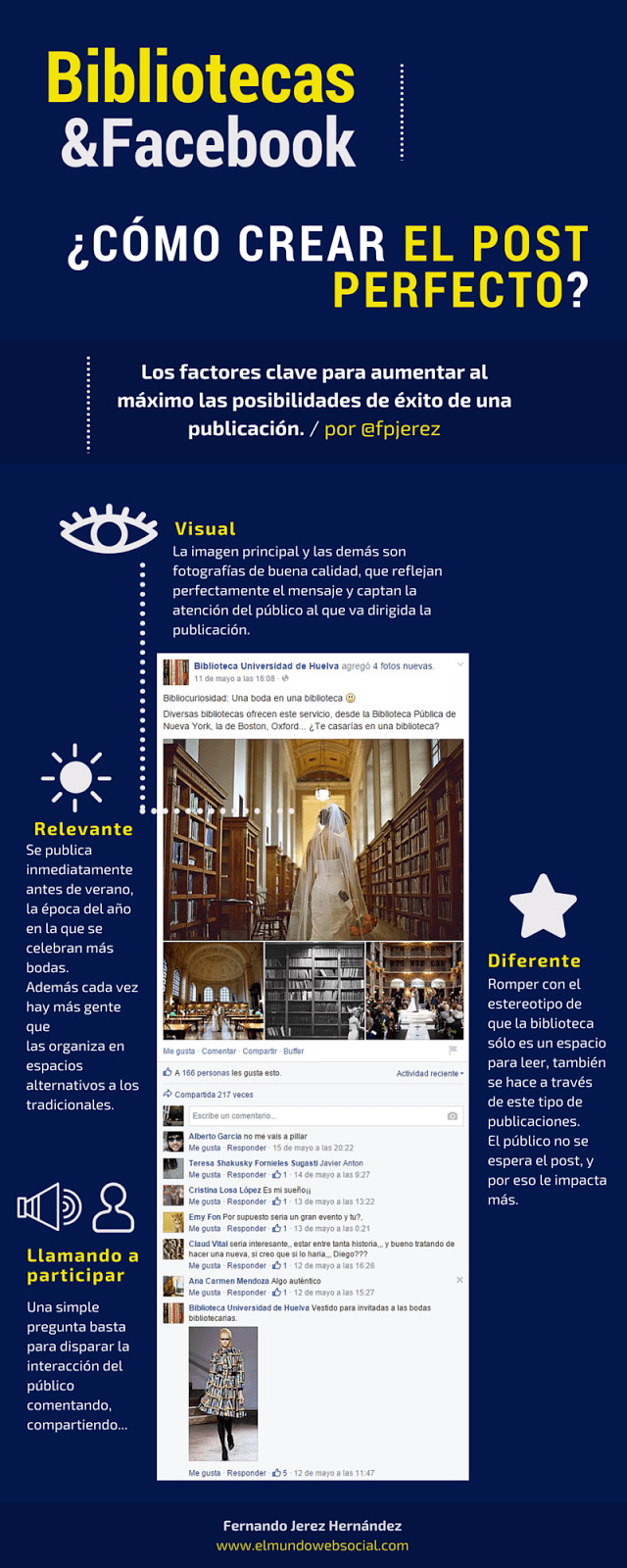 El objetivo de esta infografía es tener una visión global de la mejor manera de llegar a la gente a través de un post de Facebook de una biblioteca. En este caso el tema puede ser frívolo o superficial, pero la técnica no afecta a la materia del post, y se puede utilizar con temas más relevantes y acordes con nuestros objetivos (importantísimo: ¡nunca dejar éstos de lado!).