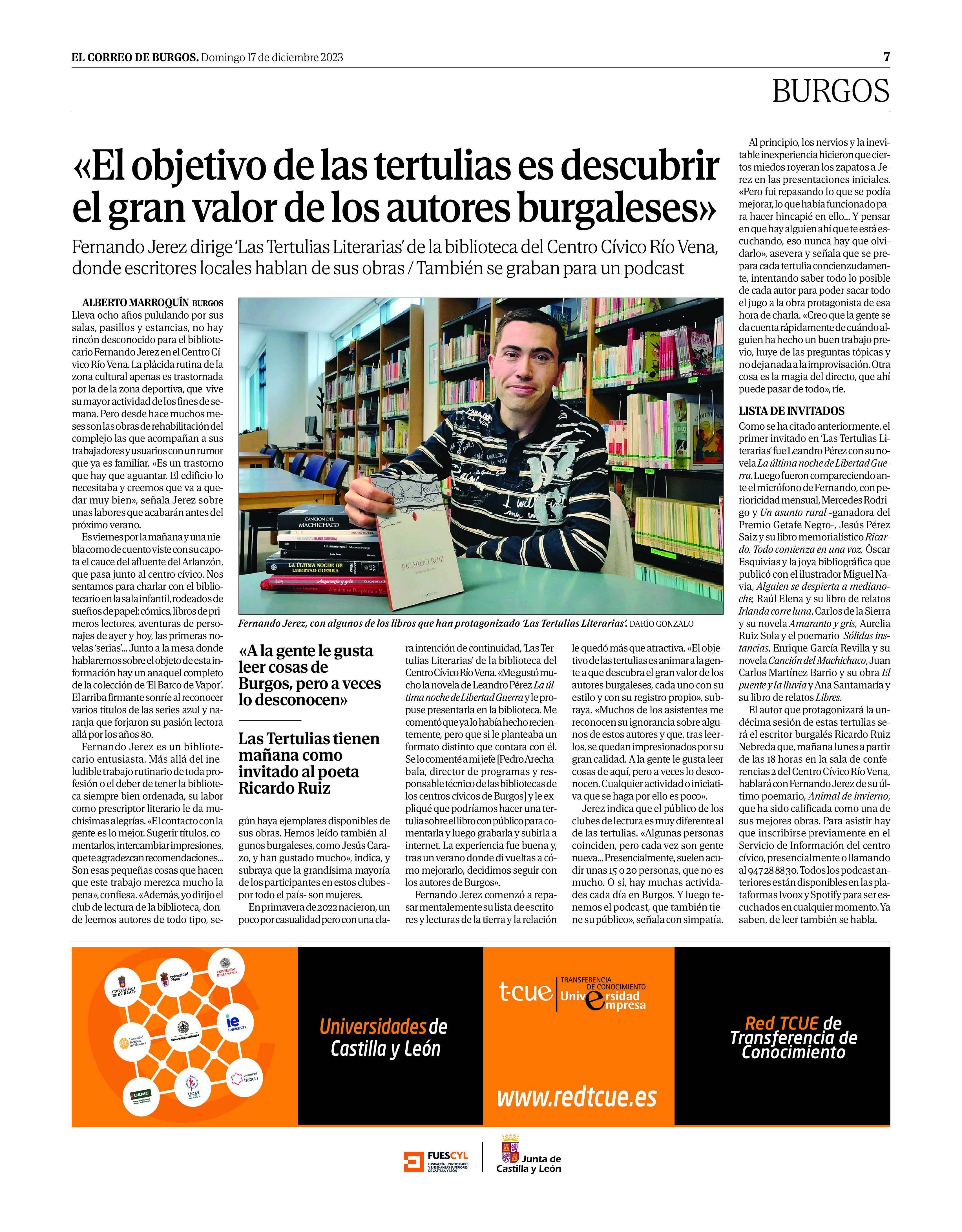 Entrevista en ‘El Correo de Burgos’ (17/12/2023) Publicado el diciembre 17, 2023octubre 4, 2025 de fpjerez «El objetivo de las tertulias es descubrir el gran valor de los autores burgaleses» https://www.elcorreodeburgos.com/cultura/231216/189139/fernando-jerez-mi-objetivo-tertulias-descubrir-gran-valor-autores-burgaleses.html Comparte esto: Compartir en WhatsApp (Se abre en una ventana nueva) WhatsApp Compartir en X (Se abre en una ventana nueva) X Compartir en X (Se abre en una ventana nueva) X Comparte en Facebook (Se abre en una ventana nueva) Facebook Compartir en LinkedIn (Se abre en una ventana nueva) LinkedIn Imprimir (Se abre en una ventana nueva) Imprimir Me gusta Cargando... Publicado por fpjerez Ver todas las entradas de fpjerez
