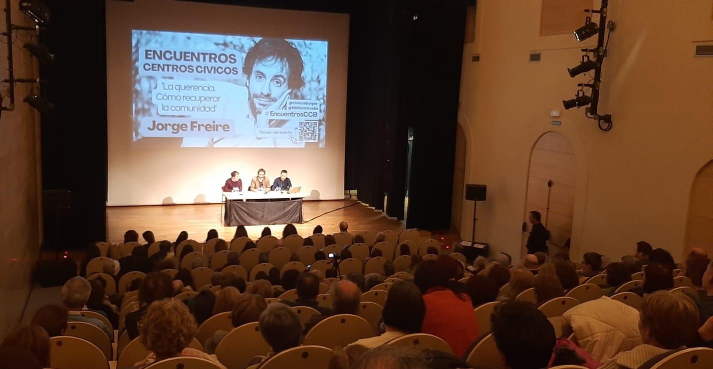 Ante 250 personas que llenaron el salón de actos del Centro Cívico ‘San Agustín’ de Burgos, Freire impartió su conferencia bajo el título: ‘La querencia: cómo recuperar la comunidad’, en la que abordó las causas del destejimiento social, y aportó algunas ideas y propuestas para su regeneración.