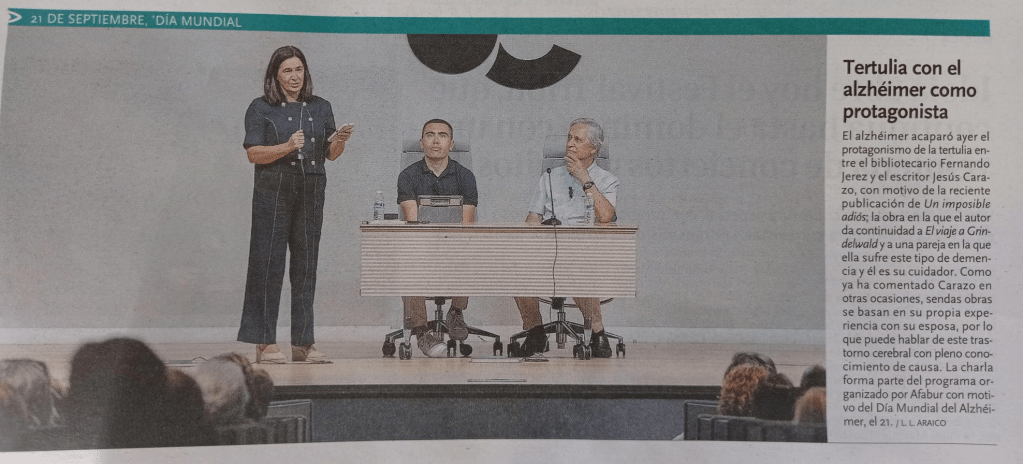 El pasado miércoles 17 de septiembre, invitado por la asociación Alzheimer Burgos (AFABUR), e inaugurando los actos por la Semana Alzheimer, tuve el placer de conversar con el escritor Jesús Carazo a propósito de su última novela ‘Un imposible adiós’, en el salón de actos de la Fundación Círculo.